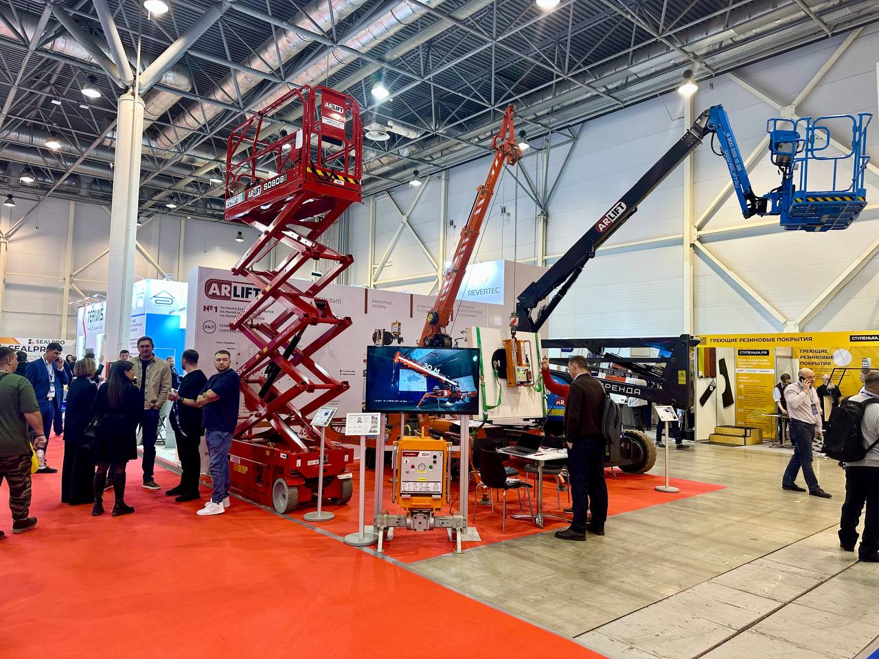 По традиции на нашем стенде была представлена техника из арендного парка Арлифт. Флагманы среди вакуумного оборудования — вакуумные захваты Arlifter GS-500 для монтажа стекла и сэндвич-панелей и Arlifter SP4 для стенового и кровельного монтажа: неизменные участники выставки! Разработанные и собранные на собственном производстве компании, с учетом суровых погодных условий, захваты соответствуют всем требования ГОСТ и могут выполнять работы при осадках и отрицательных температурах.