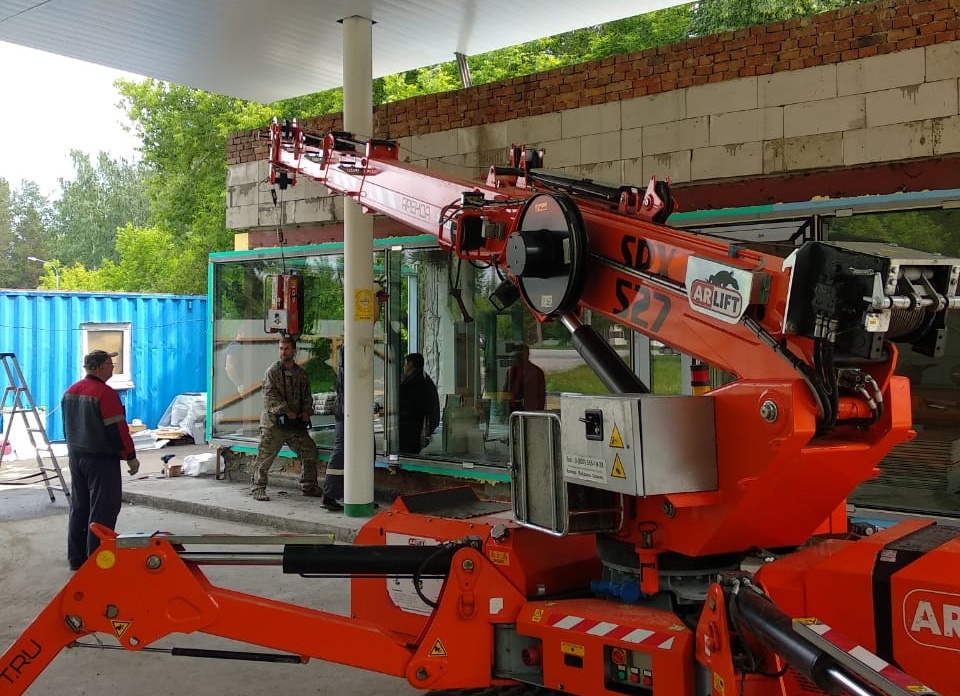 Поэтому в одном из районов Новосибирска для работы на автозаправочной станции было принято решение использовать мини-кран SPX527CDH и вакуумный захват Arlifter GS-500. Помимо тяжелого крупногабаритного стеклопакета весом в 400 кг, который необходимо было установить на одну из витрин прилегающего магазина, сложность заключалась в том, что все работы проводились на территории, сильно ограниченной по высоте.