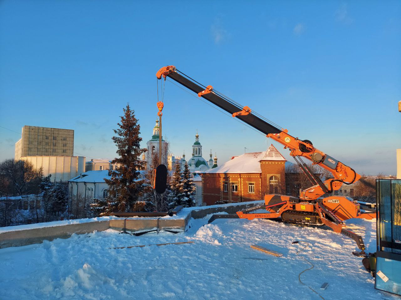 Каждый стеклопакет весил 850 кг — это максимальная грузоподъёмность вакуумного захвата ARLIFTER GS-850. Стекло перемещали с помощью мини-крана SPD 129 HJ, установленного на крыше. Поднимали пакеты с земли и переносили к точке монтажа.